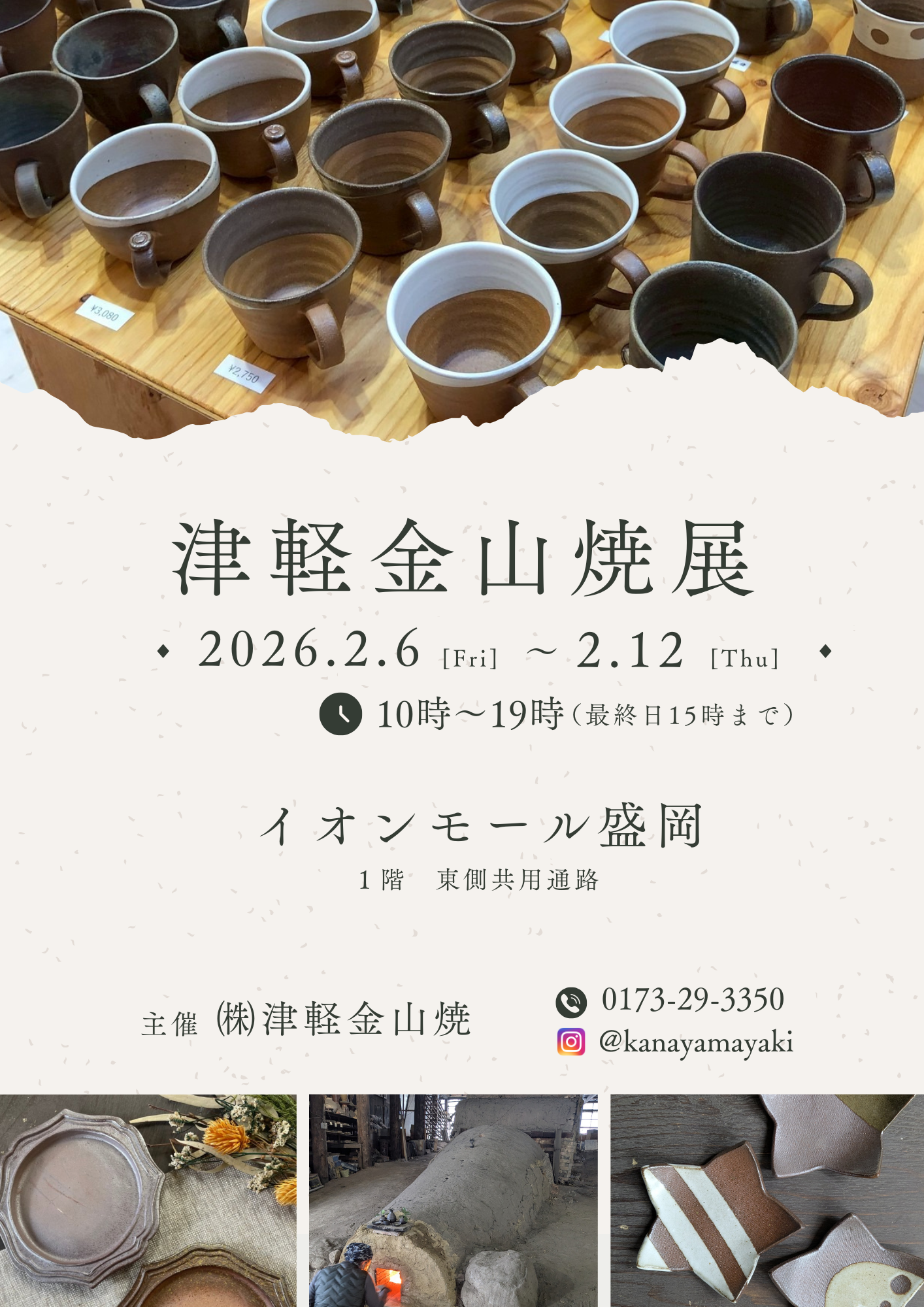 イオンモール盛岡にて「津軽金山焼展」開催【2/6~2/12】 2025年12月23日Shibata 岩手県にあるイオンモール盛岡の1Fにて「津軽金山焼展」を開催します! 昨年に続き2回目の開催! 今年も人気の商品を取り揃えて皆様のお越しをお待ちしております! 毎日先着100名様に金山焼の箸置きをプレゼントいたします(*’ω’*) たくさんの方々にお会いできるのを楽しみにしています。